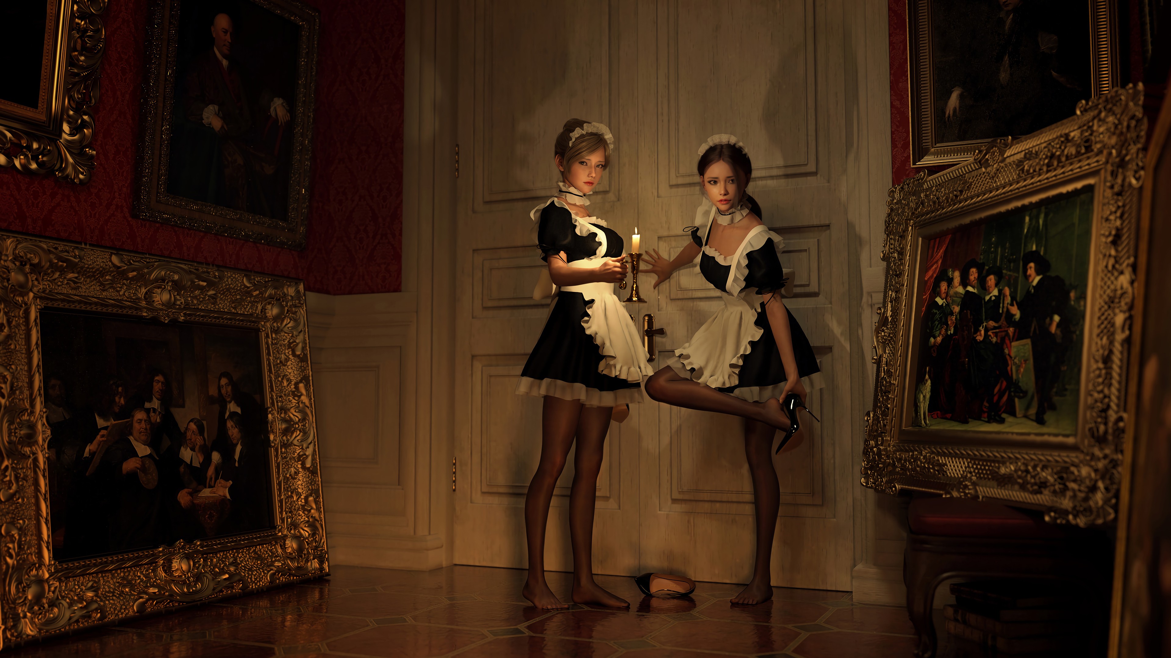 3D绘画 女仆 美腿 黑丝 高跟鞋 两位女仆进门后的一幕 4k动漫壁纸
